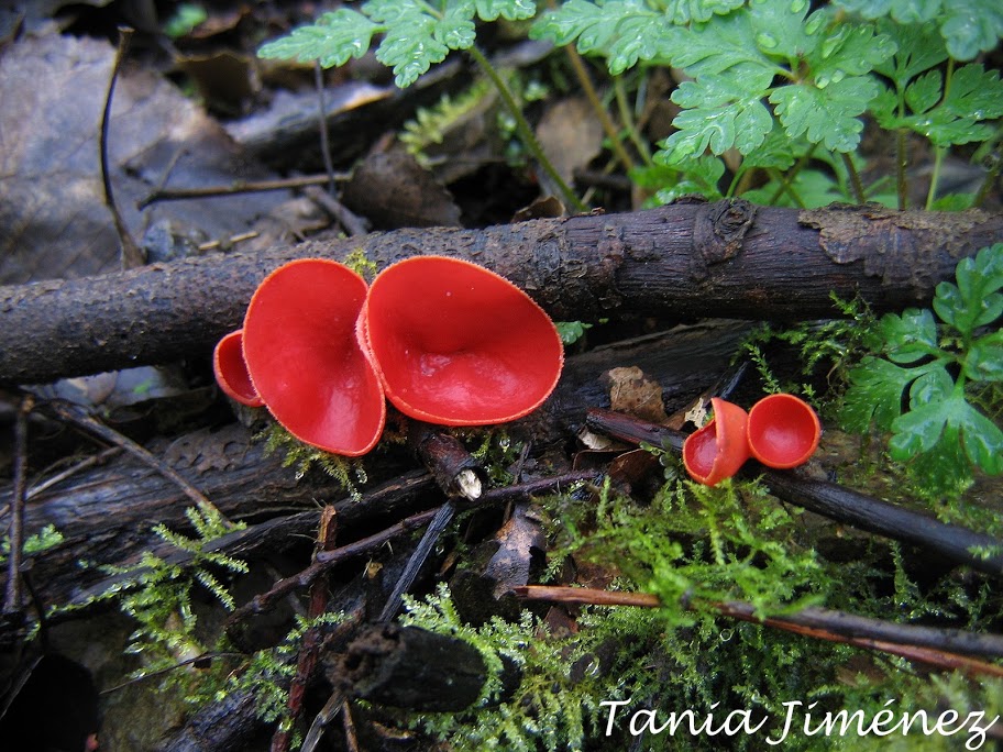 Cupuliforme, fins a 5 cm. Peu blanquinós i curt. Interior de color escarlata i exterior més blanquinós