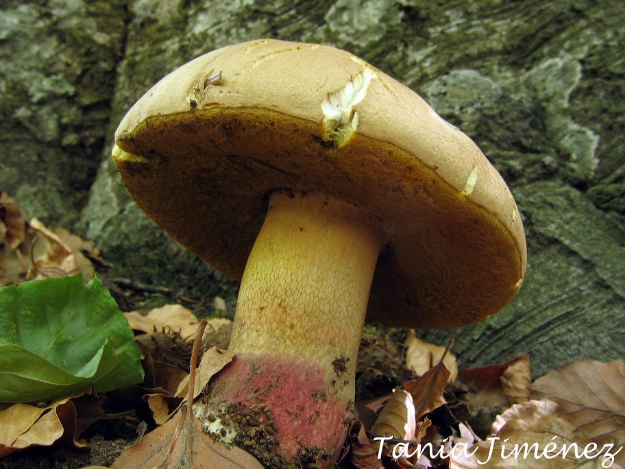 barret ocre o gris clar, superfície vellutada. Tubs groc clar de jove. Peu groc, vermell a la part inferior, cobert per un reticle. La carn es torna blava al premer.